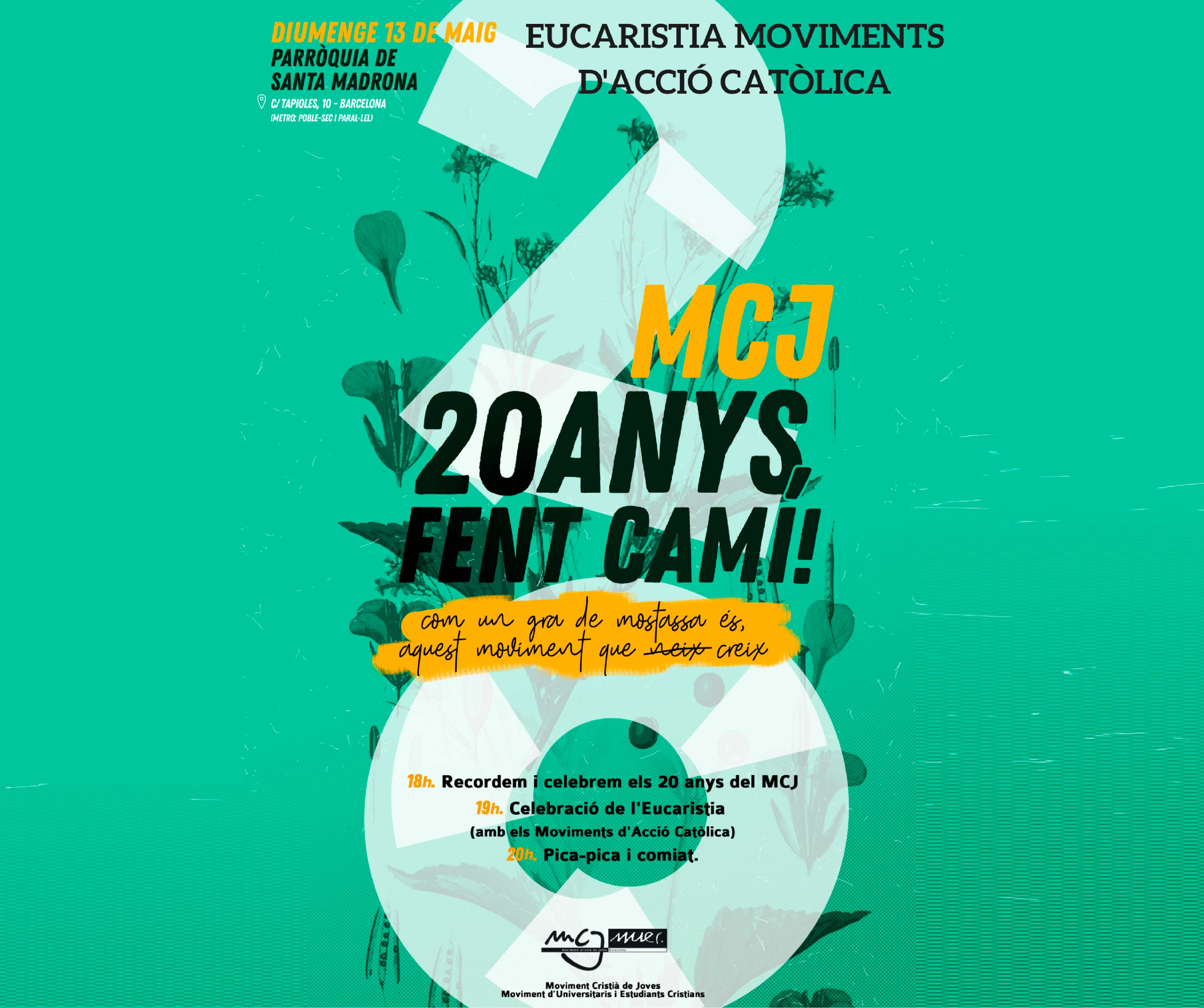 El Moviment Cristià de Joves (MCJ) ha celebrat els seus 20 anys, envoltat de totes aquelles persones que hi han format part des dels seus inicis. La parròquia de Santa Madrona ha acollit l’acte que ha començat amb els parlaments de persones importants pel moviment. Primerament ha parlat la presidenta del MCJ, Àngels Carrió qui ha conduït una mica l’acte, donant pas tots els testimonis, com l’antiga presidenta del moviment, Sílvia Urbina, que han parlat del moviment en termes passats, amb nostàlgia dels bons temps viscuts; presents, amb la celebració dels 20 anys i futurs, animats per aconseguir els reptes que venen.