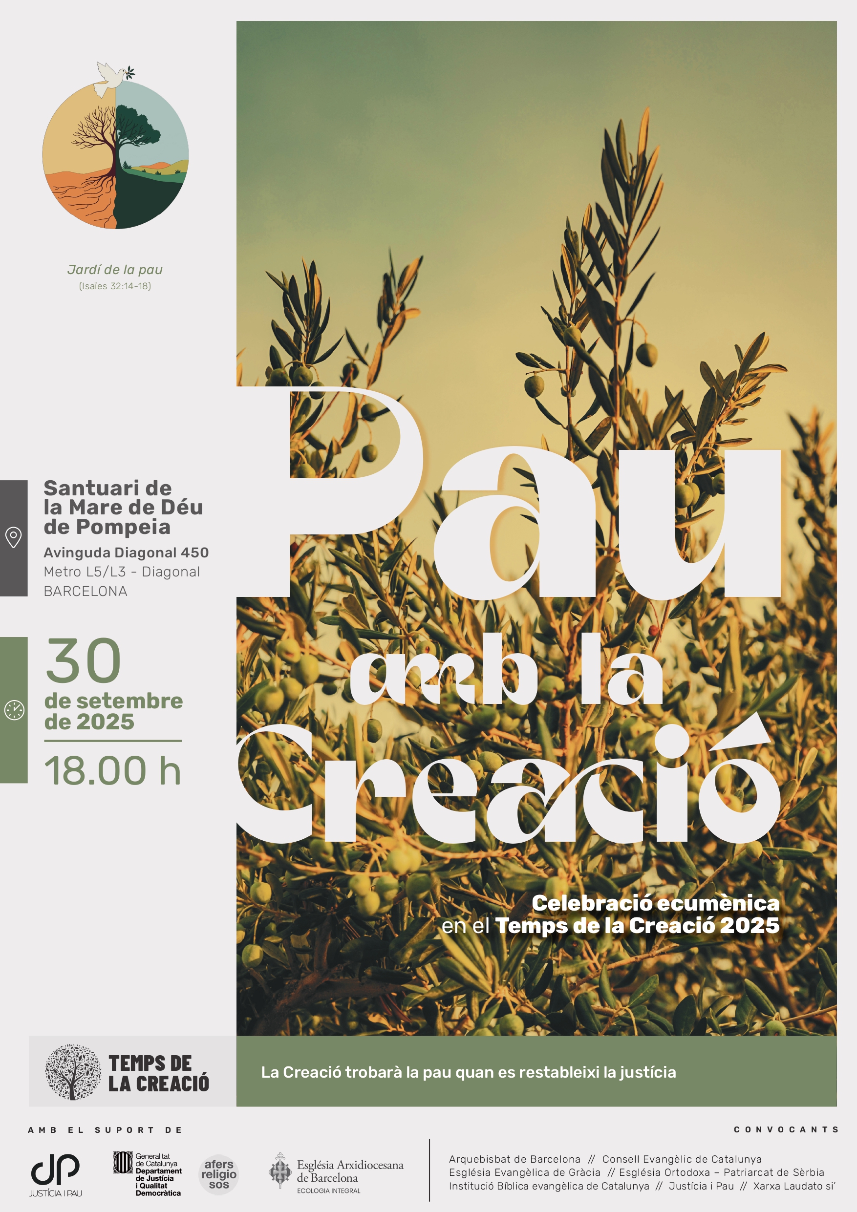 Justícia i Pau encetem un nou curs amb noves activitats. Com cada any, arriba la celebració ecumènica del Temps de la Creació, sota el lema ‘La Creació trobarà la pau quan es restableixi la justícia’. L’acte es celebrarà el dimarts 30 de setembre, a les 18:00 h, al Santuari de la Mare de Déu de Pompeia (Avinguda Diagonal, 450).