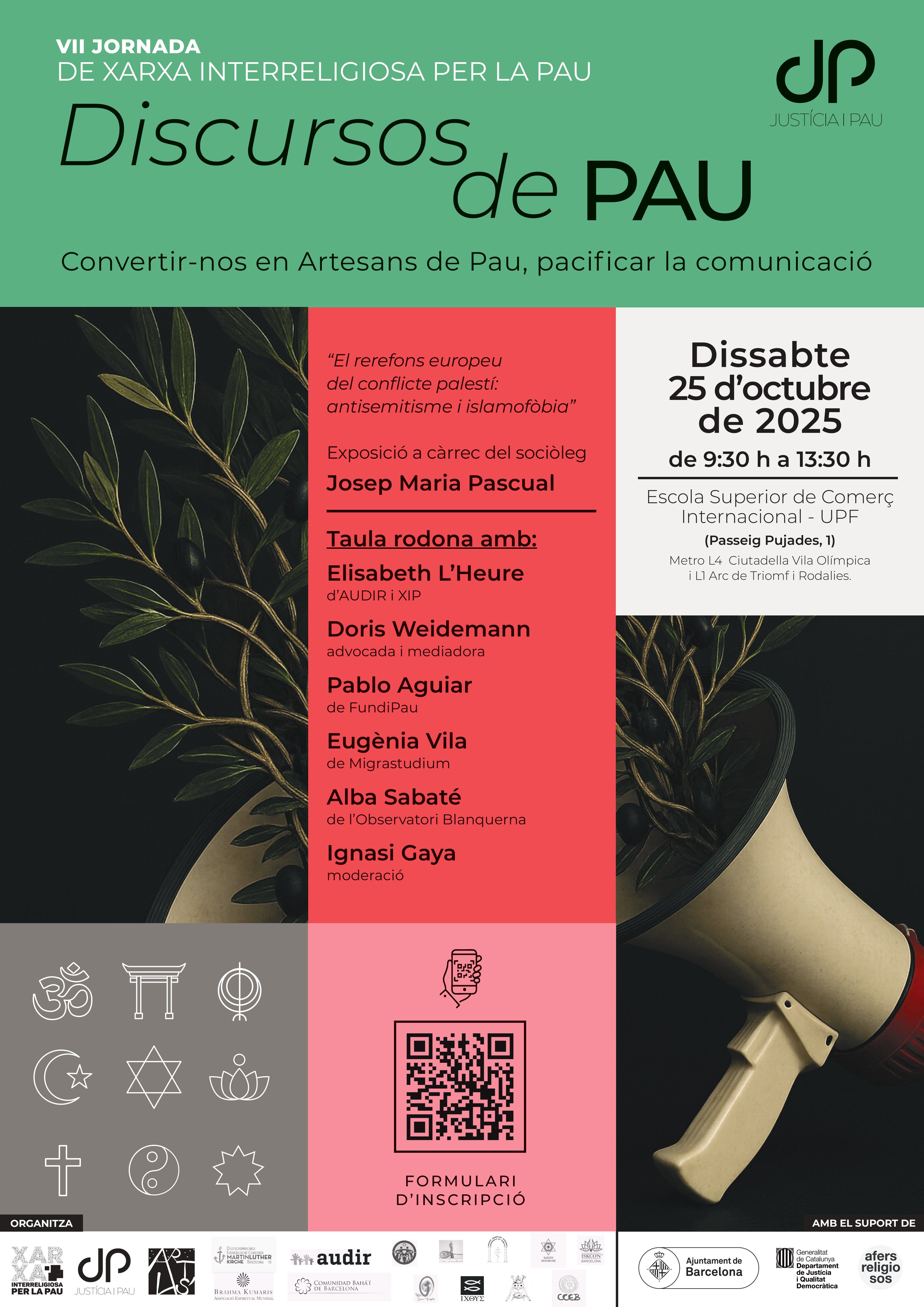 En primer lloc, ja podem compartir amb vosaltres la informació sobre la VII Jornada de la Xarxa Interreligiosa per la Pau. Enguany sota el títol ‘Discursos de Pau. Convertir-nos en Artesans de Pau, pacificar la comunicació’, la Xarxa dona continuitat amb la temàtica de l’any passat on es va parlar d’espiritualitat, pau i mitjans de comunicació. Reserveu-vos la data: dissabte 25 d’octubre, de 9:30h a 13:30h, a l’ESCI (Passeig Pujades, 1). Cal inscripció prèvia a: https://forms.cloud.microsoft/e/PYcbrr6qH4