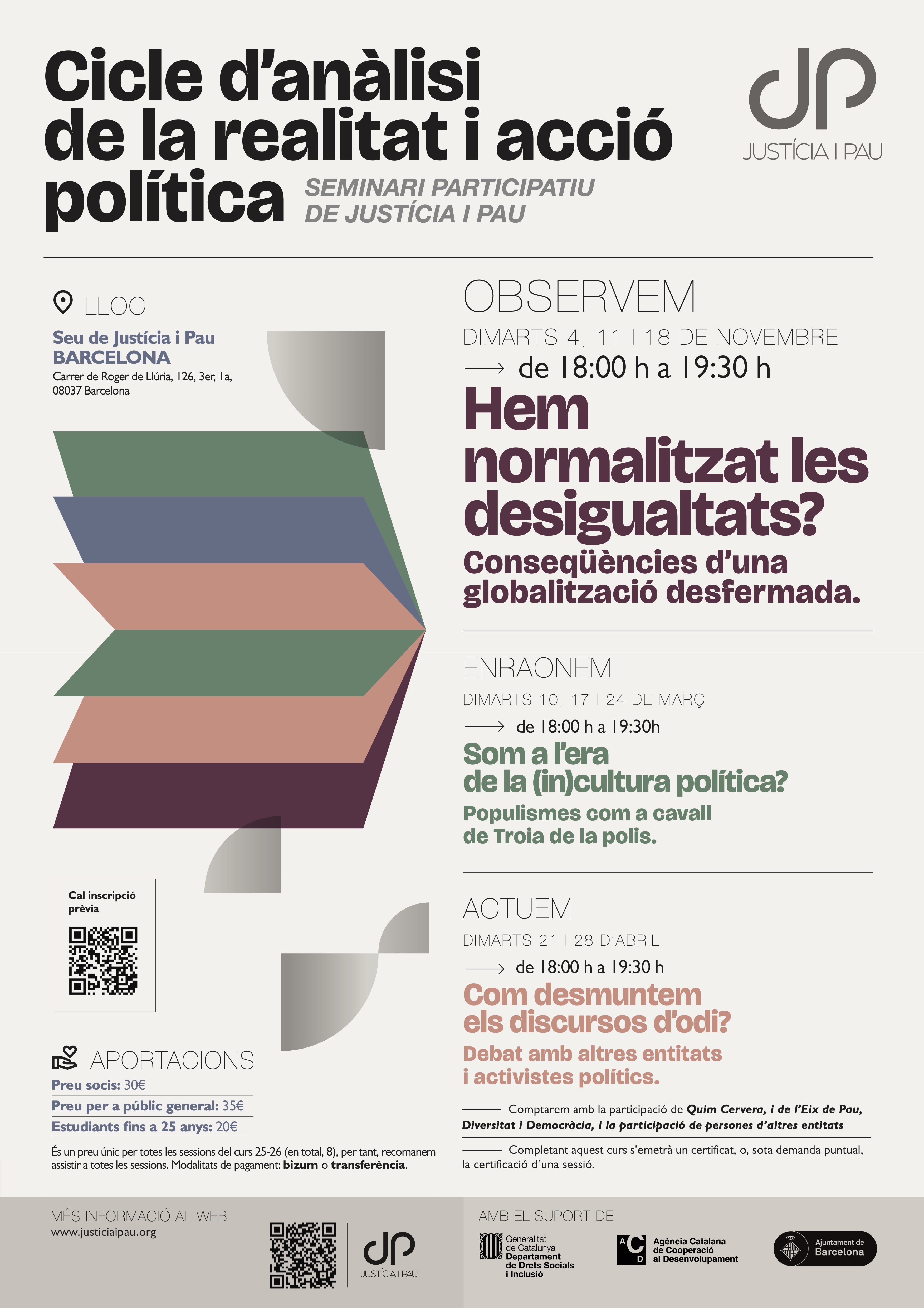 En segon lloc, també us volem informar del proper cicle de formació política que organitzem per aquesta tardor. Dividit en tres blocs, i amb un total de 8 sessions, analitzem la realitat política actual, les desigualtats, i els discursos d’odi. El primer bloc comença amb sessions els dimarts 4, 11 i 18 de novembre, a la seu de Justícia i Pau (c/Roger de Llúria, 126, 3r 1ª). Podeu trobar la informació de pagament al cartell i al web de Justícia i Pau, i també cal inscripció prèvia: https://forms.cloud.microsoft/e/mz9Lks0DcL