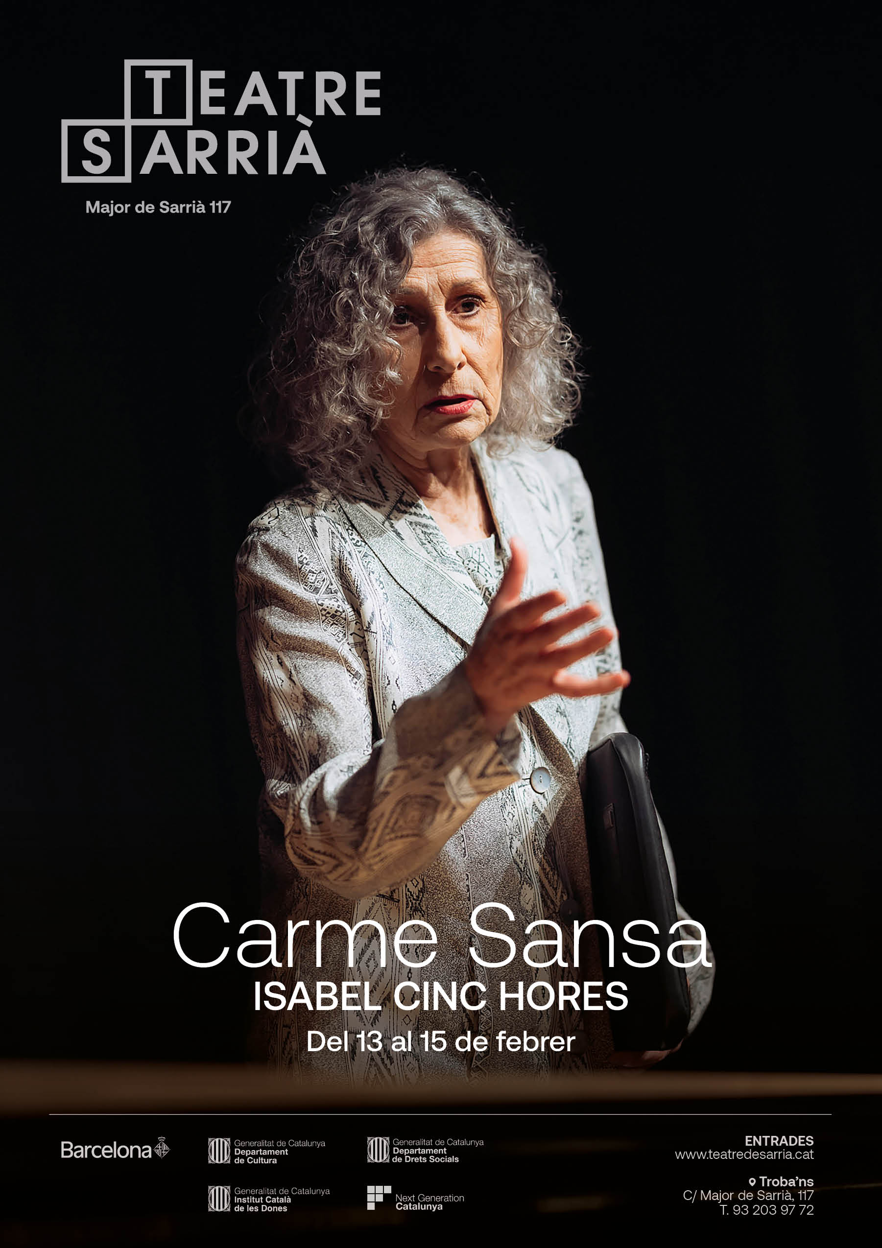 Bon dia, L’actriu Carme Sansa celebra el 83è aniversari de trajectòria artística amb l’agenda repleta d’activitat La reconeguda artista catalana compleix 83 anys aquest mes de febrer, i ho celebra presentant per partida triple l’obra ‘Isabel Cinc Hores’ a Barcelona, al Teatre de Sarrià el 13, 14 i 15 de febrer. L’actriu Carme Sansa celebra aquest mes de febrer el seu 83è aniversari consolidada com una de les grans figures de les arts escèniques del país. https://teatredesarria.cat/programacio/carme-sansa-isabel-cinc-hores |