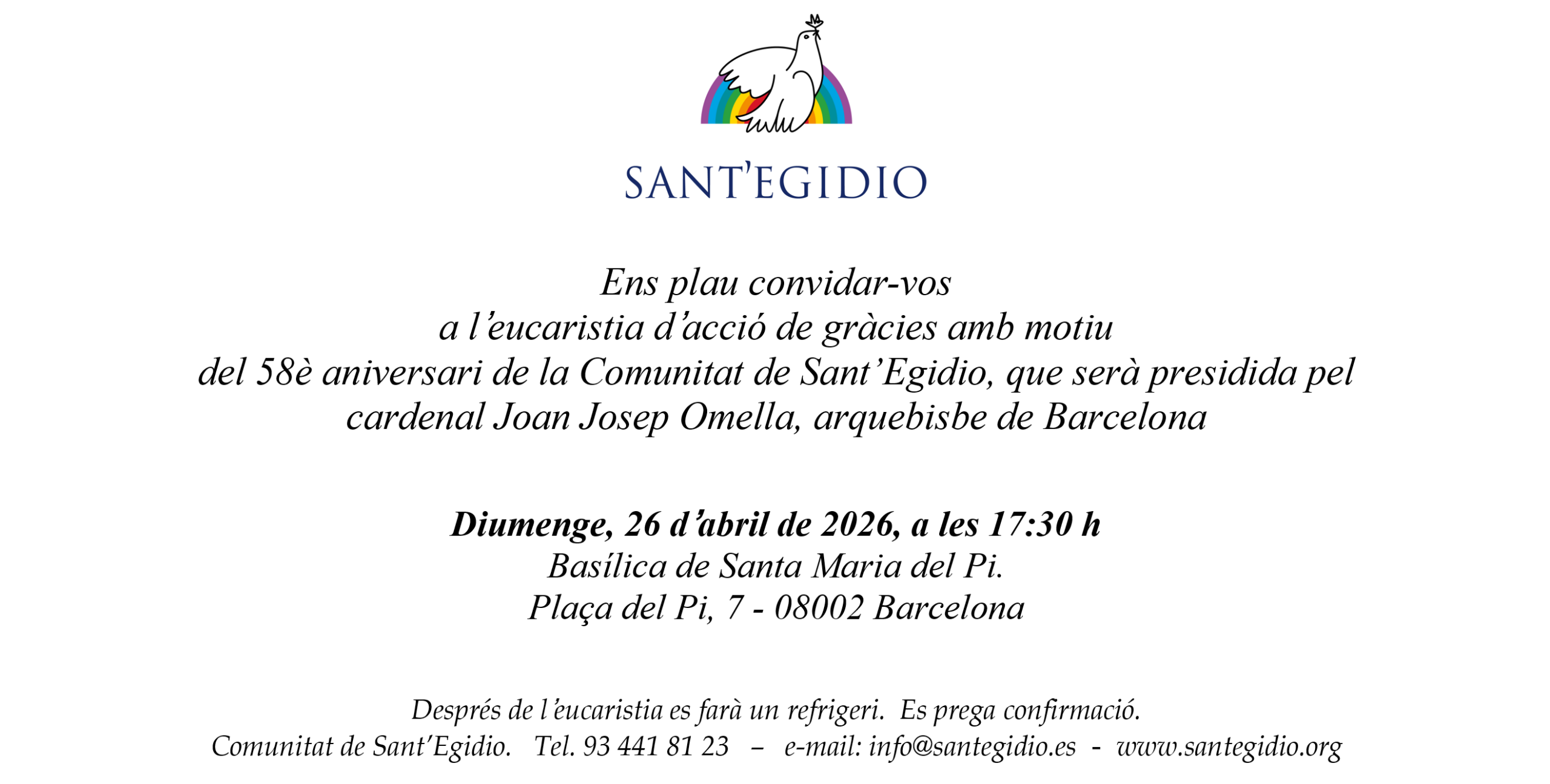 amb joia ens plau convidar-te a l’eucaristia d’acció de gràcies en motiu del 58è aniversari de la Comunitat de Sant’Egidio, que serà presidida pel cardenal Joan Josep Omella, arquebisbe de Barcelona.